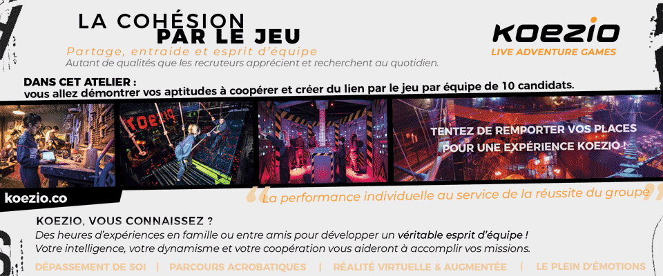 La performance individuelle au service de la réussite du groupe » prend tout son sens ici. Solidarité, entraide, esprit de groupe : autant de qualités que les recruteurs apprécient et recherchent au quotidien. Dans cet atelier vous allez démontrer vos réelles aptitudes par équipe de 10 candidats. L’équipe la plus soudée, qui aura fait preuve de la meilleure cohésion remportera le challenge Koezio !